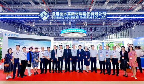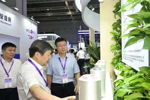 通用技術集團副總經理、黨組成員賈大風現場實地調研考察通用技術新材展團,詳細了解纖維新材料、化纖裝備制造與工程服務、紡織新材料、標準檢測與技術服務等業務板塊參展情況,并對此次展示的綠纖、特纖、高纖產品及制品的技術創新點和經濟效益及社會效益情況進行了深入溝通。
