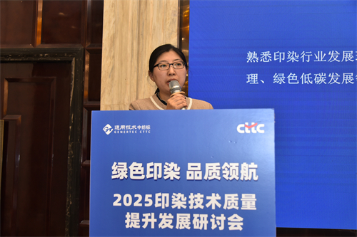 深圳中紡標質量技術部主任、高級工程師劉鵬結合近期的熱點問題,作了題為《“綠色印染,安全未來——從沖鋒衣PFAS事件解析面料印染的挑戰與創新”》的主題發言 ,講解了PFAS的功能性和風險性,分析了關于PFAS的國內外法規。她以印染工藝中的典型問題、化學殘留與環保風險、工藝缺陷導致的問題三個方面闡述了面料印染面臨的挑戰,分享了材料替代、工藝升級等綠色印染的創新路徑。