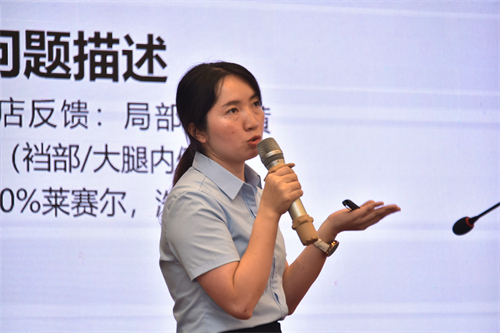 李寅在《印花產品質量管控經驗分享》的報告中,結合實際案例詳細分析了印花產品中常見的印花變色、黃變、起翹脫層、開裂等質量問題與管控方法,同時分享了印花耐濕熱色牢度檢測方法標準的相關研究,通過介紹相關顏色變化的原因、提出解決問題的辦法,結合實際退殘率數據的下降說明質量管控方法的有效性。